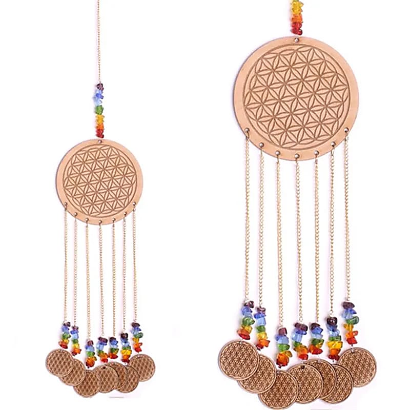 Detta hänge är tillverkat av trä med en graverad Flower of Life-symbol samt sju Flower of Life-kedjor i de sju chakrafärgerna.