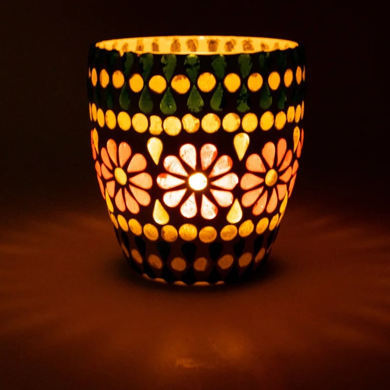 Skapa en mysig och stämningsfull atmosfär med denna mosaikljushållare i grönt och gult glas.